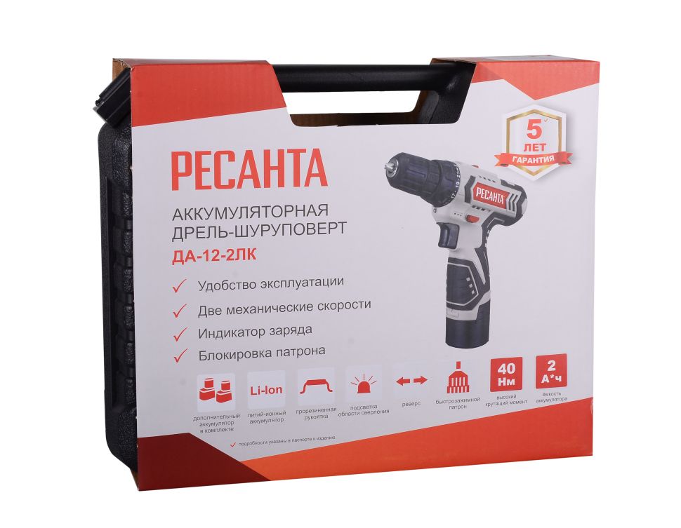 Дрель-шуруповерт аккумуляторная ДА-12-2ЛК Ресанта используется для просверливания отверстий в деревянных, пластмассовых и металлических изделиях или для работы в качестве шуруповерта. Модель оснащена 2 аккумуляторами и кейсом, незаменима для людей, постоянно использующих дрели-шуруповерты в быту.Прорезиненная рукоять обеспечивает удобное и надёжное удержание инструмента в руке во время работы. Быстрозажимной патрон облегчает замену рабочей оснастки. Двухскоростной редуктор для удобства ведения различных работ. Реверсивный механизм предназначен для быстрого изъятия сверла из материала в случае застревания, выкручивания или ослабления крепежа. С помощью регулировки частоты вращения инструмент можно настроить под необходимую толщину материала. Модель работает от надёжного литий-ионного аккумулятора (Li-Ion). Преимущества:- Удлиненная форма устройства обеспечивает удобство при сверлении в труднодоступных местах, а также усиливает корпус позволяя закручивать крепеж с наименьшими трудозатратами; - Лёгкий вес и прорезиненная ручка обеспечивает комфортную работу даже при длительном использовании шуруповерта; - Возможность регулировки крутящего момента позволяет использовать шуруповерт для работы практически с любым материалом (дерево, металл, пластмасса); - Быстрозажимной патрон позволяет легко и быстро менять биты или сверла. - Наличие кейса позволяет хранить в безопасности шуруповерт, а также облегчает его транспортировку.Кроме того, литий-ионный аккумулятор имеет ряд преимуществ: - не имеют «эффекта памяти», а значит могут заряжаться из любого состояния; - обладают минимальной способностью саморазрядки; - имеют значительную ёмкость; - обладают троекратным превосходством перед никель-кадмиевыми источниками питания по количеству циклов зарядки-разрядки; - имеют небольшие размеры, что объясняется конструкцией источника питания, состоящего из нескольких миниатюрных элементов.