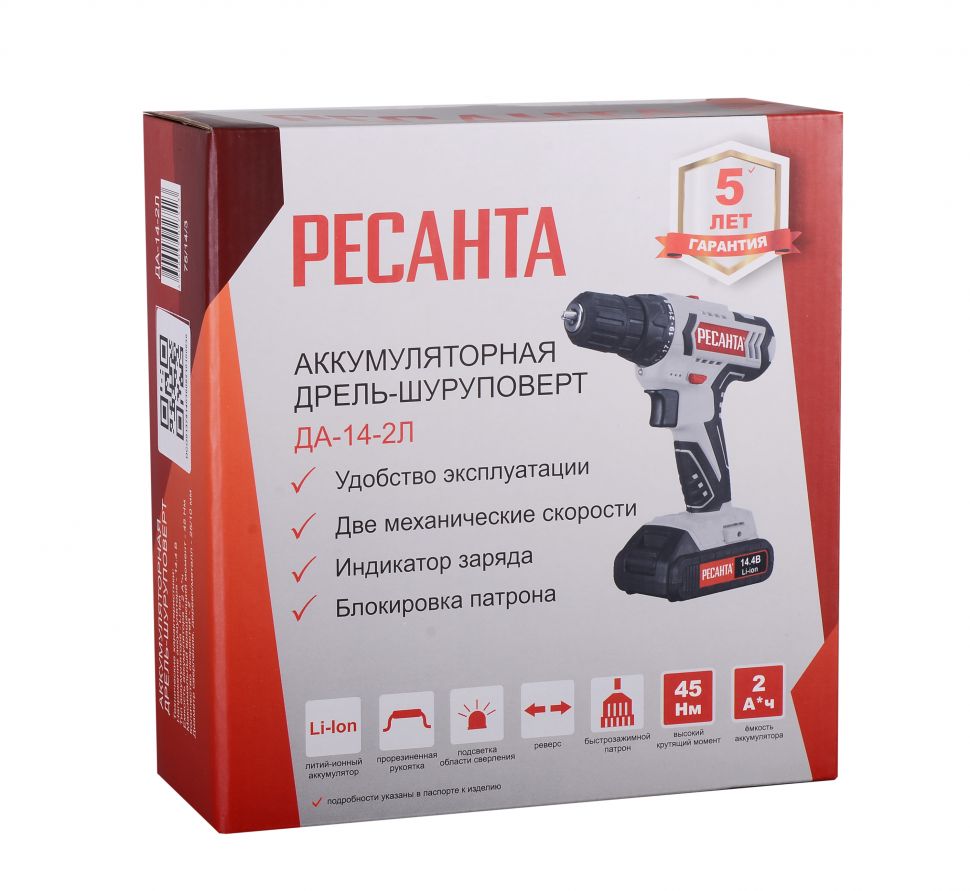 Дрель-шуруповерт аккумуляторная ДА-14-2Л Ресанта используется для просверливания отверстий в деревянных, пластмассовых и металлических изделиях или для работы в качестве шуруповерт. Модель оснащена аккумулятором и незаменима для людей, постоянно использующих дрели-шуруповерты в быту.Прорезиненная рукоять обеспечивает удобное и надёжное удержание инструмента в руке во время работы. Быстрозажимной патрон облегчает замену рабочей оснастки. Двухскоростной редуктор для удобства ведения различных работ. Реверсивный механизм предназначен для быстрого изъятия сверла из материала в случае застревания, выкручивания или ослабления крепежа. С помощью регулировки частоты вращения инструмент можно настроить под необходимую толщину материала. Модель работает от надёжного литий-ионного аккумулятора (Li-Ion). Преимущества:- Удлиненная форма устройства обеспечивает удобство при сверлении в труднодоступных местах, а также усиливает корпус позволяя закручивать крепеж с наименьшими трудозатратами; - Лёгкий вес и прорезиненная ручка обеспечивает комфортную работу даже при длительном использовании шуруповерта; - Возможность регулировки крутящего момента позволяет использовать шуруповерт для работы практически с любым материалом (дерево, металл, пластмасса); - Быстрозажимной патрон позволяет легко и быстро менять биты или сверла.Кроме того, литий-ионный аккумулятор имеет ряд преимуществ:- не имеют «эффекта памяти», а значит могут заряжаться из любого состояния; - обладают минимальной способностью саморазрядки; - имеют значительную ёмкость; - обладают троекратным превосходством перед никель-кадмиевыми источниками питания по количеству циклов зарядки-разрядки; - имеют небольшие размеры, что объясняется конструкцией источника питания, состоящего из нескольких миниатюрных элементов.