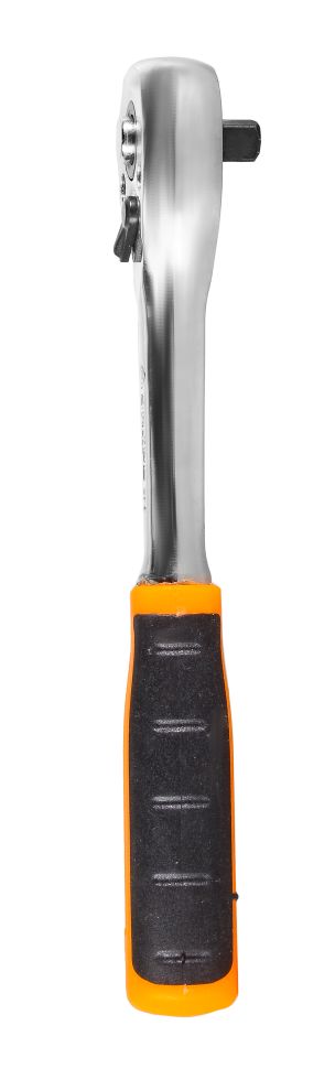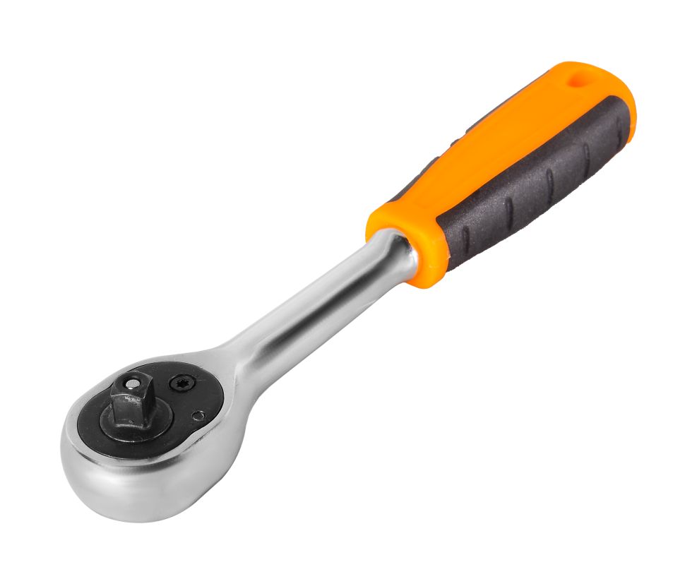 Трещотка предназначена для быстрого и эффективного закручивания или откручивания крепежа. Инструментом удобно пользоваться в условиях ограниченного пространства, когда нет возможности выполнить полный оборот вокруг гайки. Используется в быту и при авторемонте. Особенности: Рабочая часть изготовлена из CrV стали и обладает особой прочностью. Хромированное покрытие надёжно защищает трещотку от коррозии. Трещотка снабжена механизмом быстрого сброса насадок, что ускоряет процесс работы. Двухкомпонентная рукоятка не выскальзывает из ладони. Трещоточный 72-зубцовый механизм обеспечивает плавность хода, а малый угол поворота в 5° позволяет работать в ограниченном пространстве. Наличие в трещотке храпового механизма обеспечивает быструю смену направления вращения и упрощает работу в труднодоступных местах.