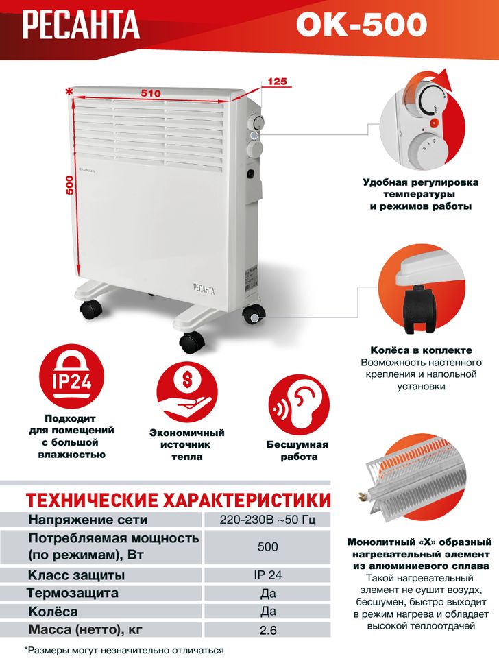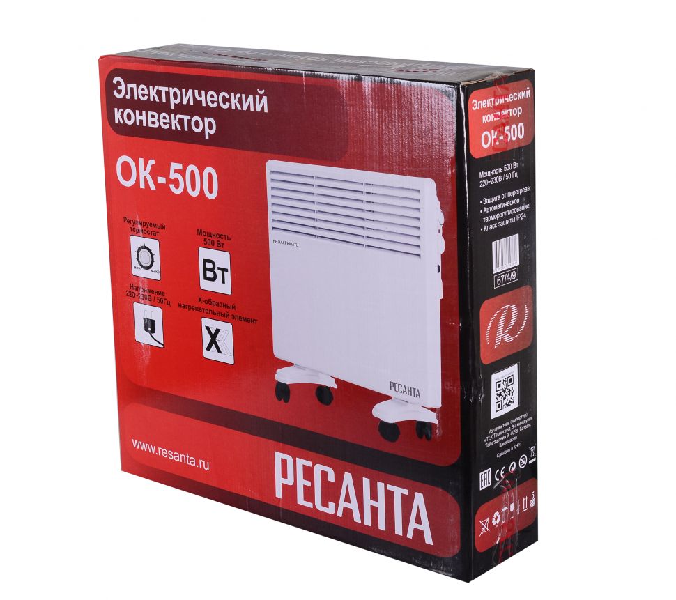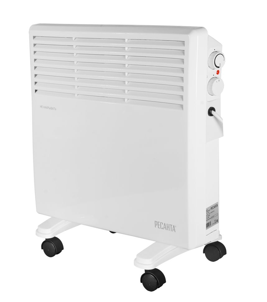 Электрический конвектор РЕСАНТА ОК-500 для обогрева помещений. Состоит из нагревательной части (ТЭН), заключенной в нижней части корпуса со щелеобразными отверстиями снизу и жалюзи в верхней части. Данная конструкция даёт возможность воздуху беспрепятственно проходить внутри конвектора, Модели конвекторов Ресанта серии ОККонвектор отвечает международным стандартам качества, сочетая в себе передовые технологии и эргономичный дизайн. Тепловая техника специально адаптирована к российским условиям эксплуатации и рассчитана на ежедневную многочасовую работу.Конвекторы Ресанта представляют идеальное решение для дома и офиса как безопасные, экономичные и очень надёжные обогреватели. Устройства эффективно используют электроэнергию, работают бесшумно и не сжигают кислород, тем самым обеспечивая высокий уровень комфорта. В данной модели используется Х-образный нагревательный элемент. В комплекте идёт кронштейн для настенного крепления.Преимущества конвекторов Ресанта Простые и эффективные возможности управления температурным режимом. Быстрая самоокупаемость за счёт высокого КПД и скорости набора задаваемой температуры. Простота установки. Не выжигают кислород. Надёжность в эксплуатации. Лёгкость обслуживания. Эффективное использование электроэнергии. Бесшумная работа. Высокий уровень комфорта. Корпус греется максимум на 60 градусов, что делает его безопасным для прикосновений. Возможность установки во влажных помещениях (кроме серии «С»). Комплектация: Конвектор - 1 шт. Опоры - 2 шт. Колеса для опоры - 4 шт. Руководство по эксплуатации - 1 шт. Комплект для крепления на стену – 1 шт.