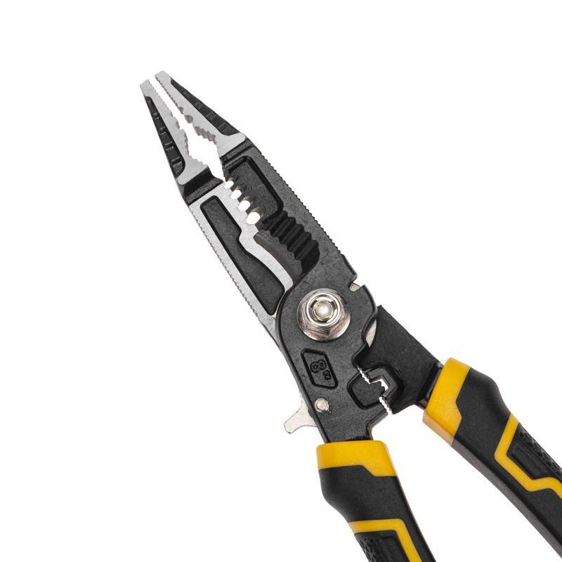Многофункциональные универсальные плоскогубцы – это инструмент на все случаи жизни, включающий в себя: плоскогубцы, тонкогубцы, бокорезы, инструмент для зачистки кабеля, резак для проводов, напильник, инструмент для обжима клемм. Используются для ремонта автомобилей, мотоциклов, механизмов и т.д. Применяются для монтажных работ, а также в быту. Плоскогубцы изготовлены из профессиональной хромованадиевой стали (60Cr-V), максимальная твердость – 60-62HRC. Оснащены износостойкими двухкомпонентными анатомическими рукоятками, которые не скользят в руках. Тип рукояток – японский. На торцах плоскогубцев расположены насечки, позволяющие использовать инструмент как напильник для тяжелых работ. Плоскогубцы обладают отличной режущей способностью, подходят для резки/зачистки пластика, медных и мягких проводов, а также для обжима изолированных и неизолированных наконечников. Также подходят для зачистки кабеля от 1,27 мм2 до 5,30 мм2.