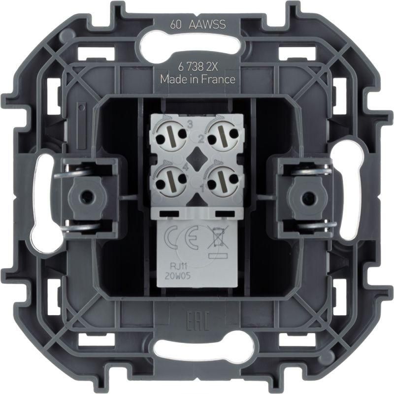 Розетка телефонная для скрытого монтажа Inspiria, разъем RJ11, цвет "Белый". Применяется для быстрого подключения к сетям телекоммуникаций (например, к телефонным сетям общего пользования).