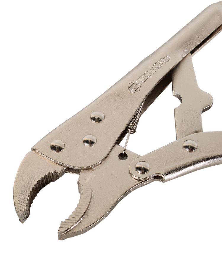 Зажим с фиксатором – универсальные клещи с механизмом регулирования раствора губок и механизмом блокировки (фиксатором, запирающим механизмом), обеспечивающим фиксацию заготовки для выполнения операций по механической обработке, сварочных и иных работ. Надёжный помощник сварщика, слесаря и строителя. Преимущества: Изготовлены из легированной стали методом ковки, что обеспечивает крепкую и надёжную конструкцию инструмента; Благодаря прочной конструкции и системе коленчатых рычагов обеспечивают надёжную фиксацию и высокое давление; Рабочие поверхности закалены для повышения твёрдости и прочности; Хромоникелевое покрытие защищает от коррозии и увеличивает срок службы; Удобный регулировочный винт позволяет регулировать усилие закрепления деталей; Конструкция позволяет использовать его в качестве трубного или разводного ключа.