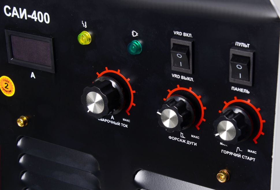 Сварочный аппарат Ресанта САИ-400 – инверторный источник питания постоянного тока, разработанный для ручной электродуговой сварки, методом ММА, плавящимся покрытым электродом. Прибор адаптирован под эксплуатирование в сетях с перепадами в диапазоне 380 (±15%) В. Этого вполне достаточно, чтобы обеспечить стабильную работу инвертора Ресанта САИ 400, в любом режиме нагрузки. В приборе реализован широкий выбор рабочего тока – от 35 до 390 Ампер. Именно в этом заключается превосходство данной модели, что делает его более эффективным и универсальным. В зависимости от типа операций и вида деталей, выбирается электрод, с максимальным диаметром 6 мм. Это даёт возможность не только варить стальные металлоконструкции, но и выполнять строжку (резку толстых заготовок). В модели реализованы самые важные функции: Антиприлипание (функция Anti Stick). Форсаж дуги (Arc Force). Горячий старт (Hot Start ). Подключение пульта ДУ.